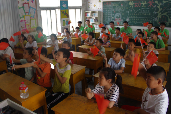 感恩爱国教育:感恩教育的目的就是培养留守儿童常怀感恩之心、孝顺之情,感恩社会。志愿者让孩子们观看亲子电影《兔子与鹿》、《老人与海》等动画短片,鼓励他们以写信和绘画的方式将自己对父母思念表达出来。7月9日上午,志愿者在高塘镇中心小学和孩子们一同举行了升旗仪式。孩子们穿着整齐的校服,佩戴鲜艳的红领巾,在《义勇军进行曲》的旋律下,孩子们抬起认真的面孔,凝视着冉冉升起的五星红旗,整齐划一地行少先队礼。为了让孩子们能更深刻地领会五星红旗对于我们每一个中国人的意义,培养孩子们的爱国精神。志愿者给孩子们讲述了从古到今、家喻户晓的爱国故事,包括霍去病、屈原、董存瑞、邱少云等英雄的事迹,激发孩子们的爱国意识。7月10日,志愿者教授孩子们学唱《红旗飘飘》。教学前,志愿者给孩子们分发了小红旗,向孩子们讲述五星红旗的重要意义。孩子们挥着手中的五星红旗,逐句学唱,在悠扬的歌声中,一点点燃气心中的爱国热情。