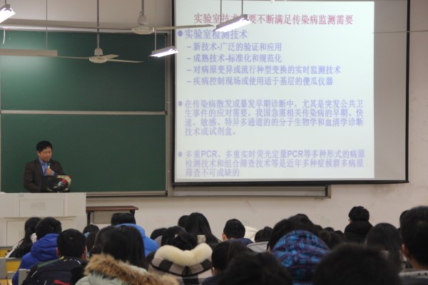 12月9日上午,应自然科学处和医学院邀请,中国疾病预防控制中心病毒病预防控制所副所长、国家麻疹室主任许文波研究员来校作报告。许文波研究员在明理105教室作了题为《病毒病实验室检测和监测技术在传染病防控中的作用》的学术报告,医学院院长张荣波主持报告会,师生代表200多人聆听了报告。