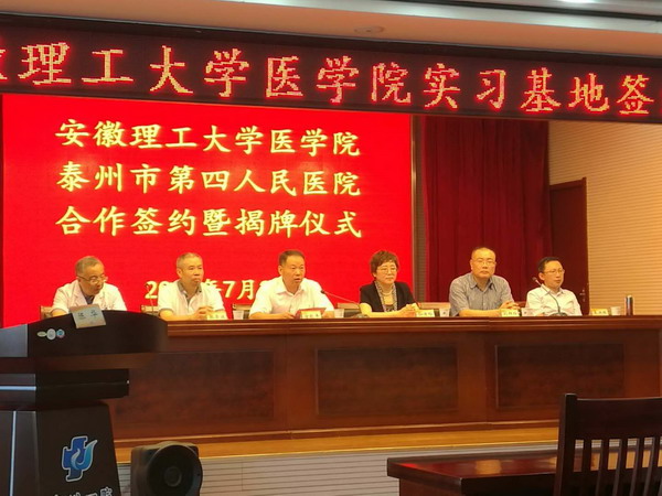 7月26日上午,安徽理工大学医学院临床实习基地签约暨揭牌仪式在泰州市第四人民医院多功能厅举行,副校长宫能平出席本次签约揭牌仪式并代表学校讲话。