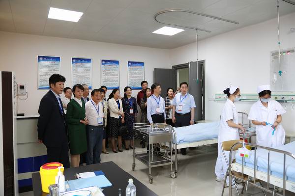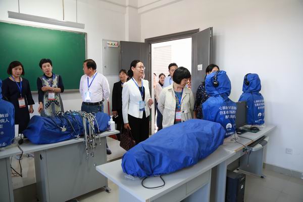 在第一附属医院,专家组一行走访了护理学专业技能实训中心,查看了模拟操作器材、设施配备情况,考察了住院医师规范化培养基地,了解了住院医师规范化培养的内容与程序、考试流程、考场设置、食宿条件等情况。