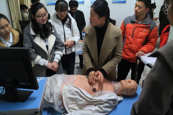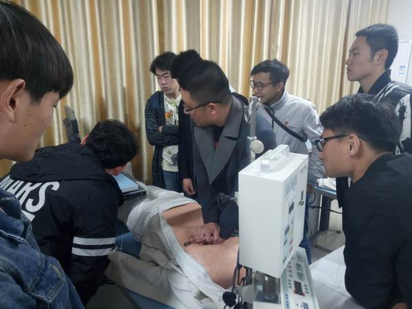 培训第二阶段为实操讲解训练阶段,主要使用心肺复苏模拟人仪器,现场演示和同步讲解了单人心肺复苏术。内容以CPR技能操作为主,配合止血、包扎、固定、搬运等内容。在老师们的悉心指导下,两院学生踊跃地在心肺复苏模拟人仪器上进行操作练习,最终多名同学“救活了”不同伤害所致心脏骤停的模拟人。