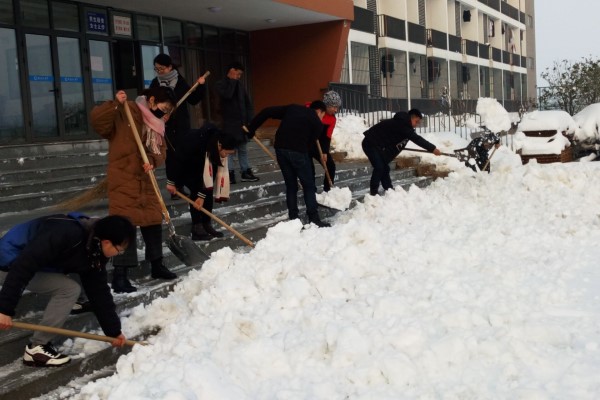活动开始前,支部书记陈冉、尤佳锋对活动进行了任务分工,并对各组的工作提出要求。紧接着各小组成员在队长的带领下分头行动,针对不同区域的楼前积雪和公路积雪进行清除,支部党员们吃苦耐劳甘于奉献的精神,吸引了众多学生和食堂工作人员踊跃加入,打造出一支干劲十足的扫雪小分队,比预计完成任务的时间缩短一个小时,宽敞的公路凸现在大家的视野中。