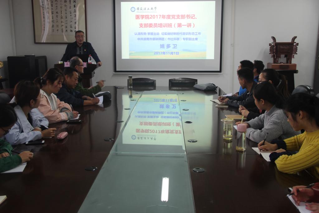 11月1日下午,医学院2017年党支部书记、支部委员培训班在崇仁楼C114会议室顺利开班,中共淮南市委讲师团(市社科联)专职副主席姚多卫受邀为培训班学员进行首次授课,他以《认清形势 掌握主动 切实做好新时代意识形态工作》为题做了专题报告。报告会由医学院党委副书记(主持工作)刘群红主持,医学院各党支部书记、支部委员及部分学生党员聆听了报告。