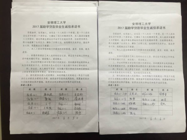 本次班会致力于促进同学们对奖助贷工作进一步的认识和了解,也更懂得诚信的重要性。会上,辅导员老师就奖助贷中的诚信问题做了宣讲,并向同学们介绍奖助贷工作开展的流程。此外,他对落实奖助贷的规范性管理提出了具体要求和措施。其次,倡议获得奖助贷的同学们:一是恪守诚信,及时还贷;二是要有积极向上的心态,严于律己,刻苦学习;三是要树立感恩意识,感恩国家、社会、学校、老师。最后,同学们积极在《安徽理工大学2017届助学贷款毕业生诚信承诺书》上签字承诺。