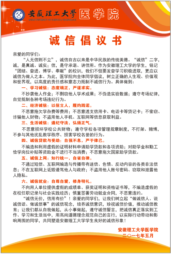 “人无信则不立”,作为医学生,应始终铭记“团结、奋进、博学、奉献”的校训,不仅要发奋学习、积极进取,更要诚信做人、诚信从医。把诚信真正落实到日常工作、学习和生活中,用高尚道德理念规范自己的言行,塑造医学生的良好诚信形象。