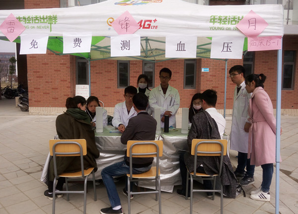 在清洁分队开展的同时,健康小分队也开始投入义诊义检活动之中,活动包括有医学常识宣传、免费义诊义检、健康咨询等环节。吸引了不少同学前来询问。志愿者分工明确,各司其职,现场严谨有序,不仅宣传了雷锋精神,做到了实践锻炼,也显示出了医学学子的风采。