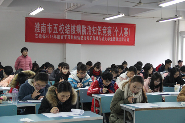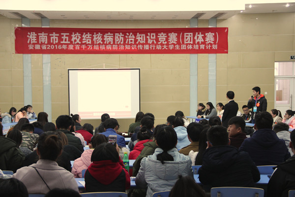 12月3日,淮南市五校结核病防治知识竞赛在我校西校区顺利举行,来自安徽理工大学、淮南师范学院、淮南联合大学、淮南职业技术学院和安徽工贸职业技术学院的150名同学参加了比赛。