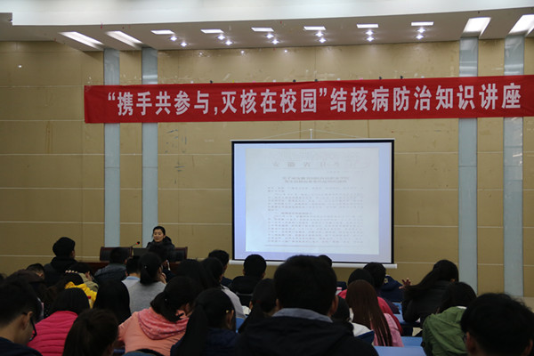 当天,医学院邀请淮南市第一人民医院预防保健科丁必芝科长,在西校区图书馆的二楼报告厅进行结核病防治知识讲座。丁科长系统地介绍结核病的发病机制、传播途径、临床症状、防治措施和及时就诊方式等内容。使在场200余名同学更加深入地了解了结核病的危害以及早发现早治疗的防治措施。