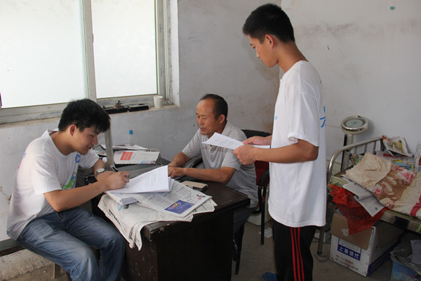 在王香铺村村委会门口,天气格外炎热,服务团志愿者们不畏酷暑,开展露天义诊,个个忙得汗流浃背。村民一波接着一波,但他们依然兢兢业业工作,认真询问,仔细检查,耐心讲解。