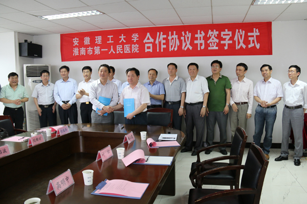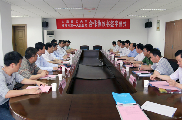 为适应新时期高等医学教育形势的发展,本着互惠互利、互相支持、共同发展的原则,我校与淮南市第一人民医院经过充分协商,决定淮南市第一人民医院成为我校非直属第一附属医院。5月28日下午,合作协议书签字仪式在我校十四楼会议室举行,安徽理工大学校长郭永存,副校长刘泽功与淮南市政协副主席、淮南市卫计委主任方严,淮南市卫计委党委书记朱传喜,淮南市第一人民医院党委书记宗强、院长杨立新等共同出席了签字仪式。签字仪式由校长郭永存主持。