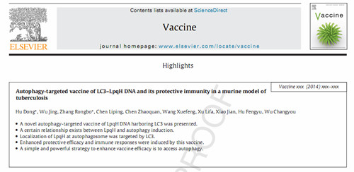 阳春三月,喜讯传来!2014年3月,我校张荣波教授、胡东副教授作为共同通讯作者、胡东副教授为第一作者、安徽理工大学作为第一单位,首次在国际疫苗领域权威杂志《VACCINE》发表论著论文。该论文首次报道了一种具有自噬体转运功能的自噬靶向性抗结核疫苗,通过小鼠感染模型证实了该疫苗的诱导保护性免疫应答能力及抗结核效应,为基于自噬的新型疫苗设计与开发提供了新的思路。另外,胡东也被该杂志编辑部邀请担任审稿专家。