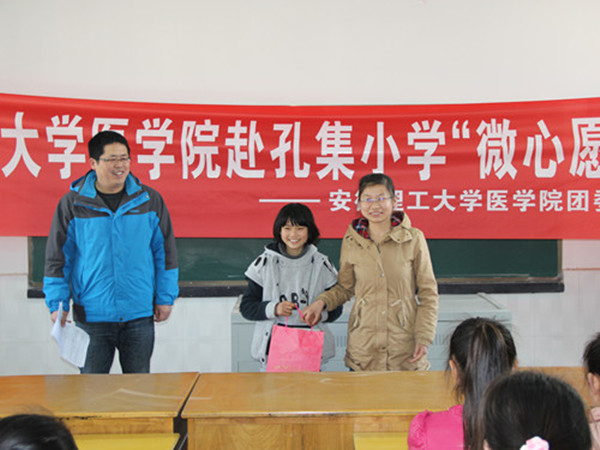 3月初,医学院团委积极响应校团委号召开展的“青春志愿行•共筑中国梦”学雷锋志愿者服务月活动,通过八公山区团委向孔集小学留守儿童进行“微心愿”征集,六年级共征集到了26个微心愿。在“微心愿”认领期间,学院团委组织利用微博、QQ和微信等网络新媒体,将一个个纯真的“微心愿”展示给学院的“白衣天使”们,一方面引起同学们对留守儿童成长的关爱,另一方面也充分展示了当代大学生志愿者良好的公益形象。