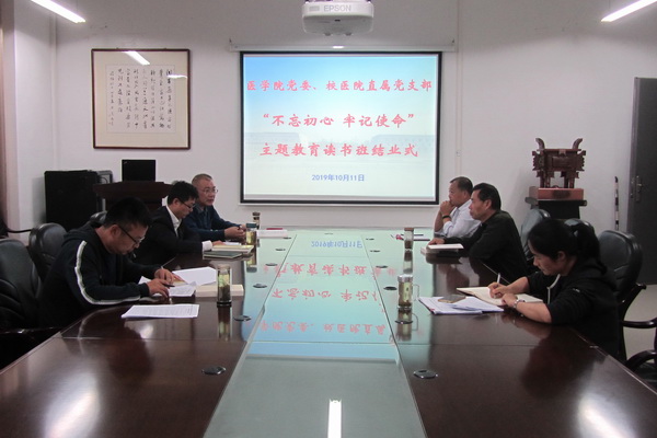 10月11日下午,医学院党委、校医院直属党支部“不忘初心、牢记使命”主题教育读书班结业式在崇仁楼C114会议室举行。医学院党委书记刘群红主持会议并作总结讲话。