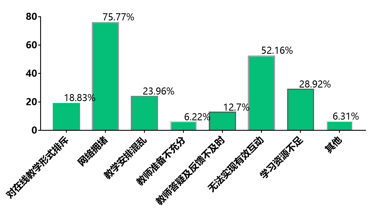 17.在教学过程中,网络拥堵依然是学生面临的主要难题(75.77%)。