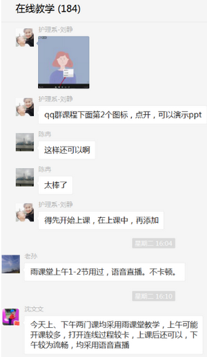 为落实“停课不停学,停课不停教”,充分做好疫情防控期间的在线教学,在线授课第一周医学院共开课27个教学班,课程23门,其中一附院课程4门课程。依据各平台运行效果及课程性质的不同情况,多数课程采用多种教学方式的混合协同模式:一方面,教师运用腾讯课堂、雨课堂等直播,运用中国大学慕课、学习通等指导学生网上学习、布置课后作业等形式开展教学工作,同时,学院还充分发挥在线教学指导微信群作用,184名教师随时分享探讨教学心得,平台运行状况,为运转教学工作保驾护航。