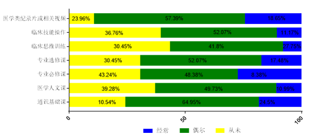 5.学生以往利用网络资源进行学习的经历较少,仅专业课程、医学类纪录片或相关视频的网络学习经历达到25%及以上,见图5。