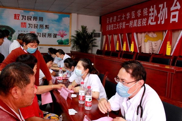 在孙台村党群服务中心,村民们早已等候在院内,认真阅读院内宣传栏中健康扶贫队张贴的新冠病毒肺炎预防、夏季常见病和脑卒中十问十答等健康宣教海报。会议室内队员们有序组织义诊义检和赠送“爱心健康包”的活动。医学院教师和学生志愿者对村民们进行身高、体重和血压的测量;校第一附属医院医师分别开设了骨科、普外科、心内科、神经内科、内分泌科、呼吸科、眼科、妇科及儿科等义诊项目,村民们在学生志愿者的引导下到相应科别进行诊治。医师们问得详细、检查得认真、回答得清楚,并给村民们仔细写出诊治建议。近两个小时的活动,秩序井然,近百名村民参与了检查诊治和咨询。同时,医学院教师和学生志愿者向村民们发放了健康知识手册和装有外伤处理、防暑和防疫等相关药品和用品的“爱心健康包”。