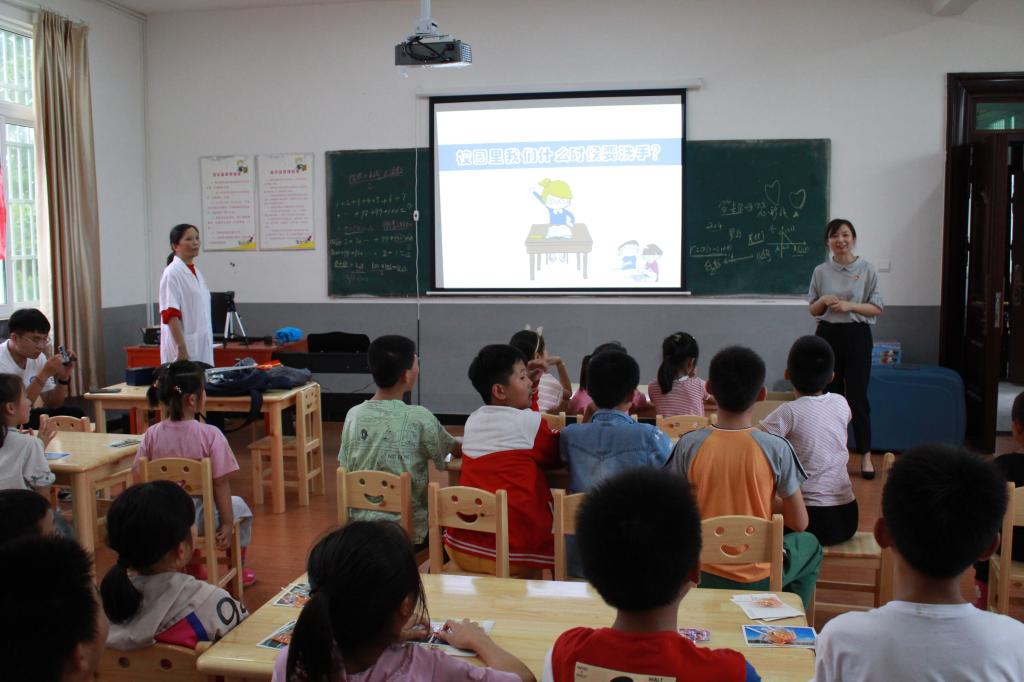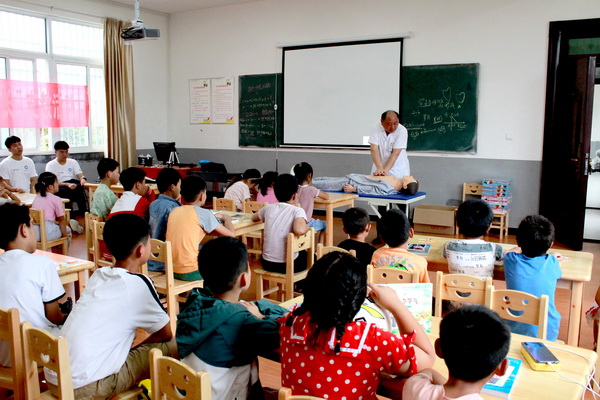 在孙台村明德小学,小学生和教师们闻讯来到“暖流教室”里,健康扶贫队的队员给他们上了一堂精彩的校园卫生和应急救护知识宣讲课。医学院教师以消除病原体,预防疾病,做好校园手卫生为主题,向孩子们介绍了做好校园手卫生的重要性和七步洗手法的具体操作;校第一附属医院医师结合模拟人示范,向孩子们介绍了夏季防触电、防溺水的常识和急救措施。主讲老师讲得生动易懂,孩子们听得认真,并积极参与现场实际操作训练,很快熟悉、掌握了两位老师传授的方法和要领。