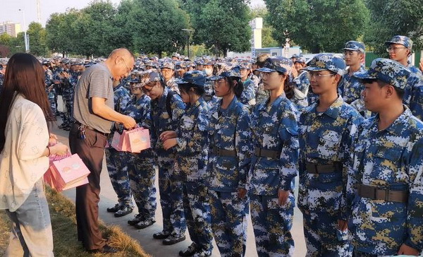 训练场上,刘群红充分肯定了同学们不怕苦不怕累艰苦训练的精神,对教官们的辛勤付出进行慰问,并为他们分发了精心准备的中秋礼品,预祝他们在校园内度过第一个开心幸福的中秋节。同学们也在教官的带领下对学院的关心表示感谢。