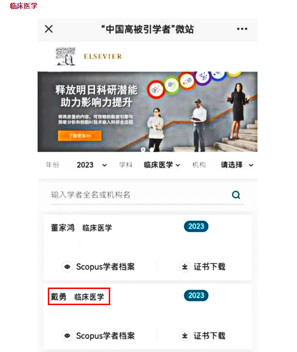 3月27日,爱思唯尔(Elsevier)重磅发布2023“中国高被引学者”(Highly Cited Chinese Researchers)榜单,我校医学部执行主任戴勇教授再次入选该榜单,这是他连续四年入选该榜单。