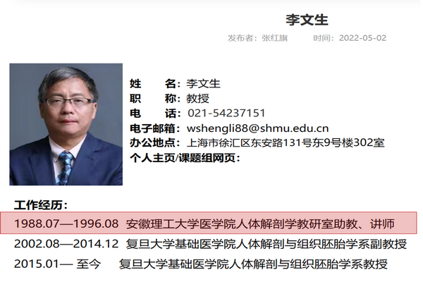 在复旦大学教授简介的突出位置可清晰的看到李文生教授在安徽理工大学医学院的工作经历,李文生教授表示,曾经在校的工作经历一直是他前进的动力,他欣然接受了学校制作的杰出校友纪念品,对母校的辛勤培养表达了衷心感谢,为母校取得的成就倍感欣喜。同时,李文生教授以复旦大学上海医学院的发展经验为参考,针对母校医学教育的特殊性和融合性保障,提出了一系列有益建议。