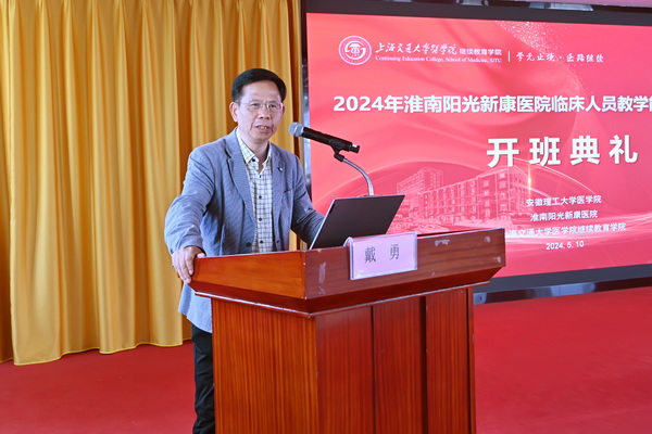 戴勇代表医学部致辞,向辛勤筹办此次培训班的上海交通大学医学院继续教育学院和淮南阳光新康医院表示感谢,对学校发展历史、办学特色,医学院发展现状等情况作了介绍,希望能以此次培训班为契机,按照“高起点、建标准、重实效”的要求,提升临床教师教学水平、规范临床教学行为、推动临床教学改革和教学质量提升,切实推进学校医学教育高质量发展。