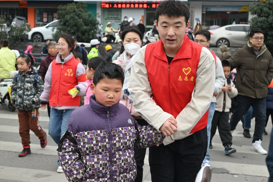 志愿者带领儿童通过道路斑马线