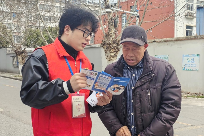 医心护夕照,爱暖桑榆情。护理23-1班的“锋”彩夕阳健康守护团,走进九久夕阳红淮南市老年公寓,为老人们发放精心准备的健康手册,讲解高血压、糖尿病的预防知识,带领老人们练习传统养生功法“八段锦”,用实际行动为老人送去关爱与健康。临床24-8班和声计划志愿队走进淮南市特殊教育学校,通过手语互动、手语歌曲表演等环节,为这里的同学们带来了欢乐与温暖。临床23-10班“锋行万里,核护健康”志愿队立足专业特色,前往新华村、玉兰苑小学、安理附小等多地开展预防结核病知识普及,提升了社会公众对结核病防治的意识。临床24-12班的青阳医使志愿队来到了新华村,为这里的青少年儿童科普“二十四节气”的传统文化,增强传统文化自信与文化认同感。临床23-5班的“锋”火相传志愿服务队与淮南市公安局交警支队田家庵一大队联合,在辖区学校周边道路开展“护学行动”,护送学生安全过马路,维护道路秩序。