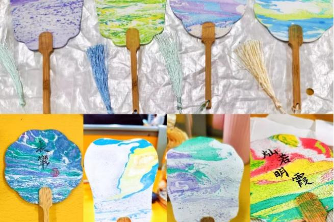 同学们分工协作,调配彩漆浓度、设计扇面构图、引导纹路走向。作品风格多元:青绿山水、泼墨花卉、几何撞色等均在水与色的交融中诞生。活动共完成近百件漆扇作品,部分还原楚汉漆器的红黑金经典配色,部分融入荧光漆点缀的赛博朋克元素。制作过程中,医学的严谨与漆艺的细致异曲同工,皆需专注与耐心。