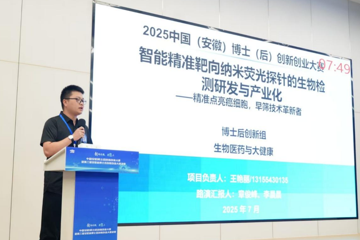 本次大赛由安徽省人力资源和社会保障厅主办,以“创新安徽等您来”为主题,设置博士后创新组、博士后创业组、博士创新组三个组别,涵盖生物医药与大健康、新一代信息技术与人工智能、高端装备制造与机器人、新能源与节能环保、新材料与石油化工、现代农业与食品等7个产业赛道。大赛吸引了来自全国的592个创新创业项目参赛,129个项目入围决赛。其中,博士后创新组共70项进入决赛,医学院“智能精准靶向纳米荧光探针的生物检测研发与产业化”项目获该赛道铜奖。该项目聚焦癌症防控这一重大民生需求,致力于通过新方法合成新探针,为实现癌症早筛早诊早治提供全新的解决方案。