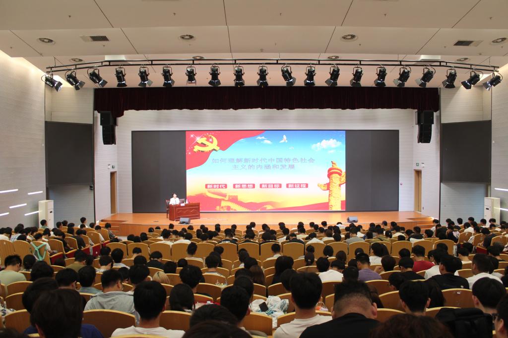 医学院党委书记张可佳以《如何理解新时代中国特色社会主义的内涵和发展》为题,围绕新时代内涵、理论来源、实践基础和体系结构四个方面进行系统阐释和深入解读,希望大家修身立德、坚定信念;加强学习、投身实践;勇于担当、成才报国。