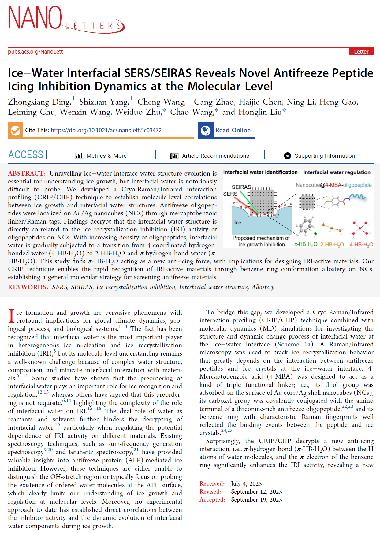 近日,我院青年教师丁中祥博士在抗冻分子机制领域取得重要进展,相关研究成果“Ice-Water Interfacial SERS/SEIRAS Reveals Novel Antifreeze Peptide Icing Inhibition”以安徽理工大学医学院为第一单位发表于国际知名期刊Nano Letters(Nature Index期刊)。该研究开发了一种低温拉曼/红外相互作用分析(CRIP/CIIP)技术,建立了冰生长和界面水结构之间的分子水平相关性,揭示了界面水结构有序度与冰重结晶抑制活性直接相关,并发现了一种新的抗冰作用力(π-HB·H2O),在生物工程领域的低温保存应用方面具有重要的科学意义。
