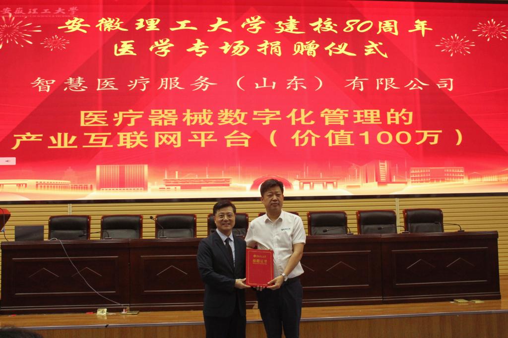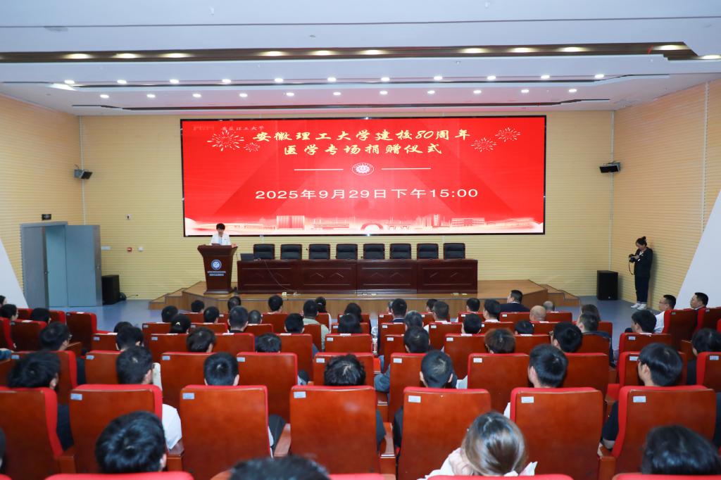 在我校喜迎八十华诞的重要时刻,9月29日下午,安徽理工大学建校80周年医学专场捐赠仪式在全重报告厅顺利举行。校党委副书记、校长袁亮院士出席仪式并致辞。淮南新华医疗集团董事长孙学文、淮南东方医院集团董事长江永强、安徽理工大学附属新华医院院长顾亚奇、安徽理工大学附属眼科医院总经理侯逸松、南京正大天晴制药有限公司安徽大区总经理吴强、江苏恒瑞医药股份有限公司安徽省管中心总经理李阳、石药集团合作发展部高级经理李蕾,以及医学检验92级校友崇育峰、医学检验98级校友谢可锐等共六家企业代表、2名捐赠校友出席活动。仪式由医学院党委书记张可佳主持。