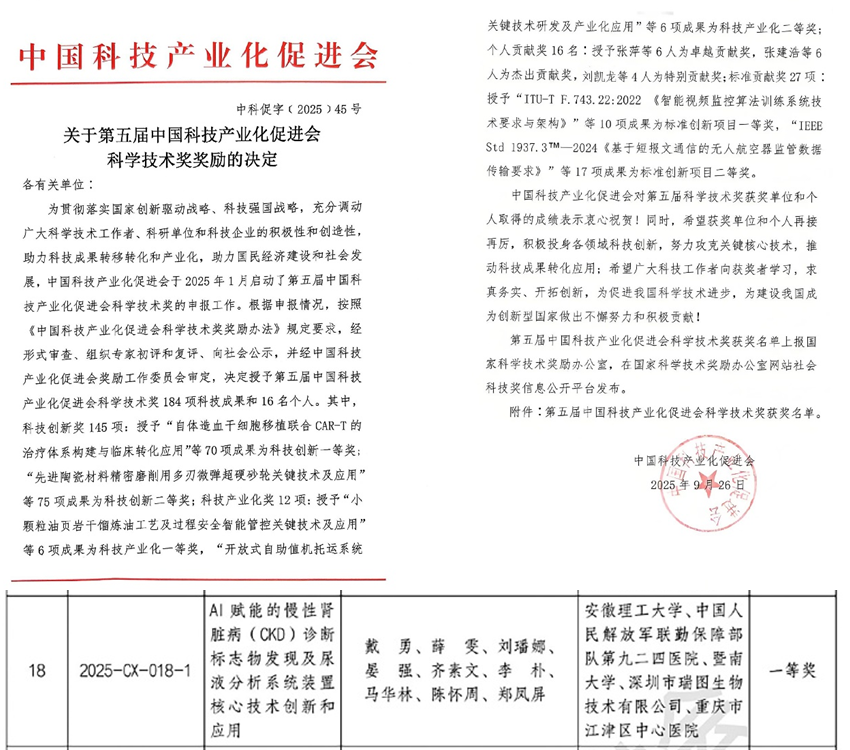根据中国科技产业促进会发布的《中科促字[2025]45号》文件,2025年度科学技术奖的评选结果已于近日正式公布。安徽理工大学戴勇教授牵头主持完成的“AI赋能的慢性肾脏病诊断标志物发现及尿液分析系统装置核心技术创新及应用”项目,在本次评选中斩获科技创新一等奖。该奖项经国家科学技术奖励工作办公室登记备案,代表项目在技术创新与产业应用方面获得国家级权威认可。