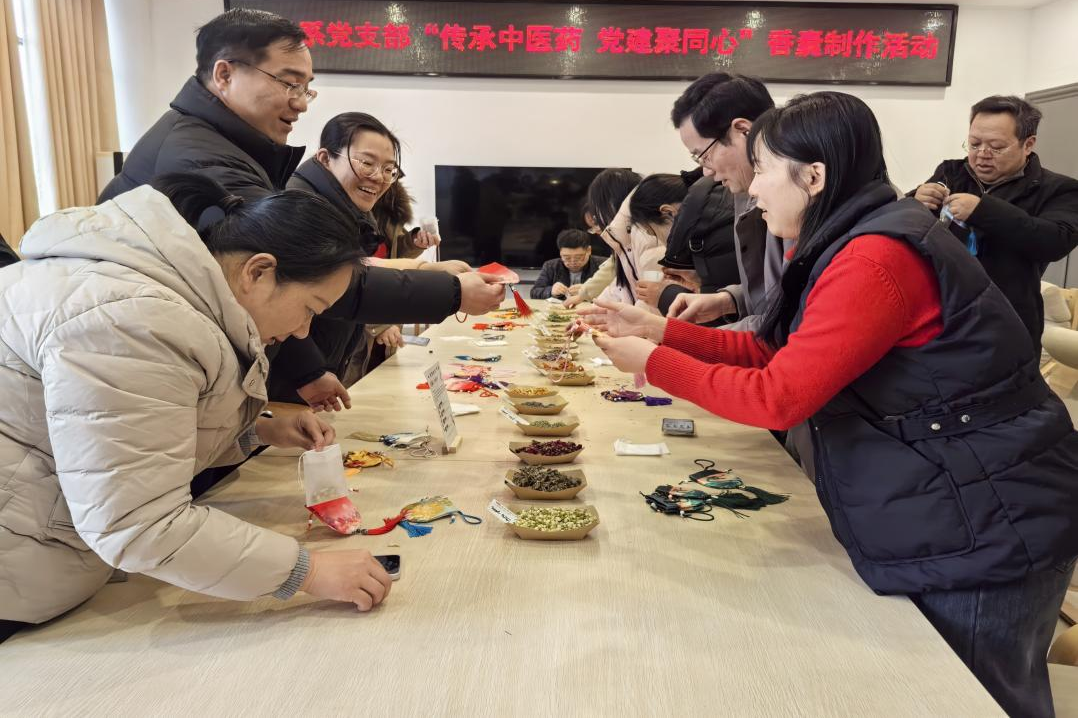活动现场,药学系党支部党员充分发挥专业优势,提前备好艾叶、木香、薄荷、香附等多种具有安神、驱邪、疏肝功效的传统中药材,以及香囊布料等手工材料。大家齐聚一堂,支部党员主动分享中医药知识,讲解不同药材的功效与配伍意义,为参与活动的教职工提供细致指导。一个个制成的中药香囊,散发阵阵本草清香萦绕鼻尖,既传递着中医药文化的独特魅力,也凝聚着党员们的心思与合力,体现出医学院以党建为纽带、以文化为载体的暖心举措。