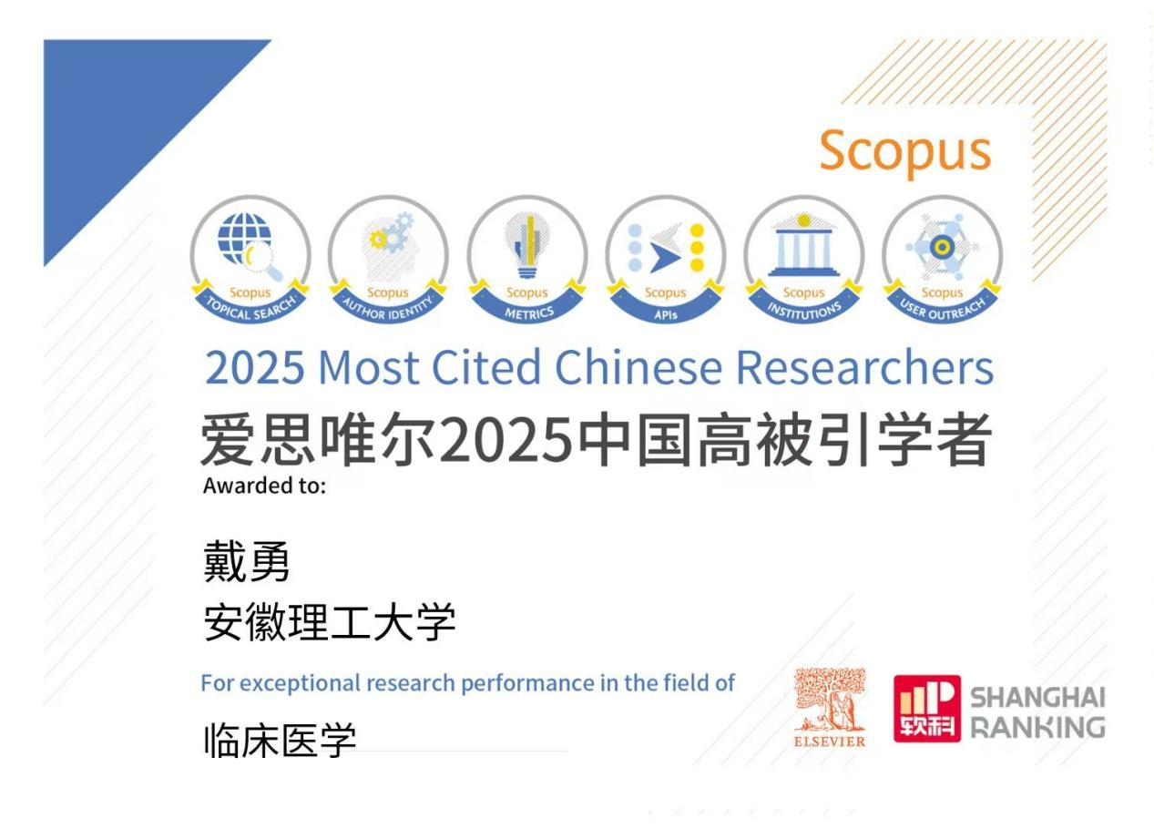 爱思唯尔“中国高被引学者”榜单以 Scopus 数据库为依托,遴选全球前1%高被引文献的学者,是衡量中国学者学术影响力的重要标尺。此次榜单,临床医学学科安徽省共有7人上榜,其中中国科学技术大学4人,安徽医科大学2人,安徽理工大学1人。戴勇教授的六度登榜,既是对其个人在肾脏内科、风湿免疫等领域顶尖科研实力的认可,也彰显了我校医学学科建设的显著成效与核心竞争力。