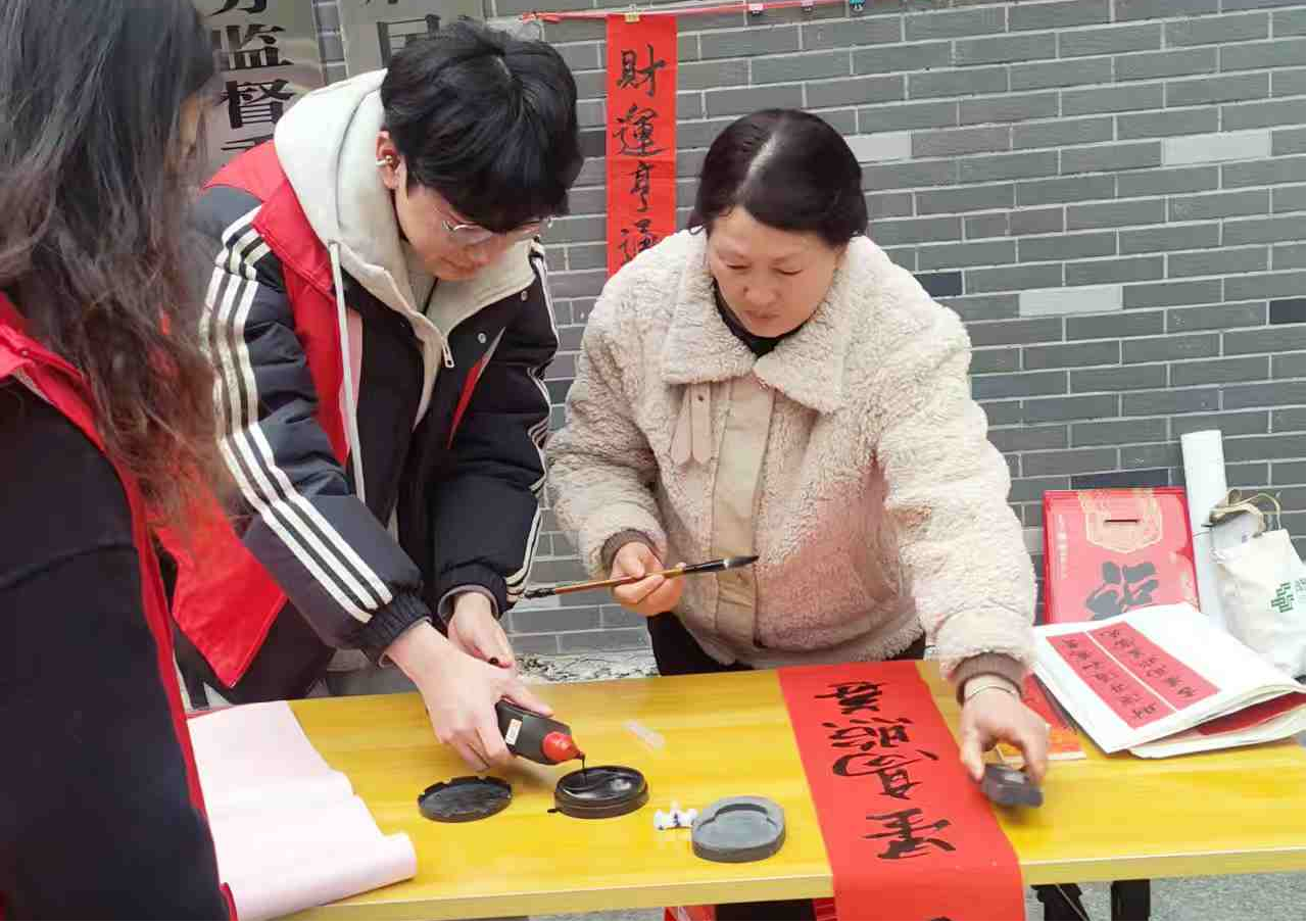 学子们助力民俗文化传承,积极报名家乡社区写对联志愿服务活动,在笔墨书香中为社区居民送上新春祝福,并与居民亲切交流,听他们讲述新年心愿,现场氛围热闹温馨,年味十足。
