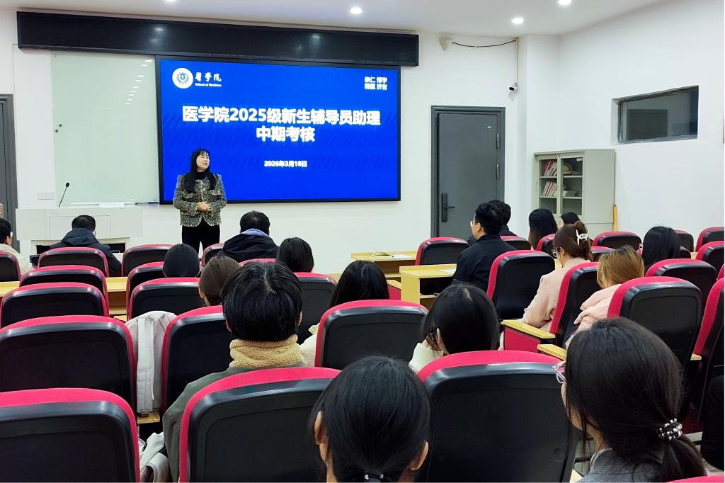 为加强学风建设,从大一新生开始培养良好学风,全面检验大一新生辅导员助理工作成效,3月18日,我院2025级新生辅导员助理中期考核汇报会在崇仁楼B119报告厅如期举行。医学院党委副书记周静、学院辅导员及全体新生辅导员助理参加会议。