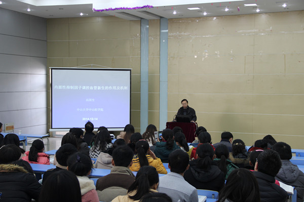 上午,高国全作题为“内源性抑制因子在肿瘤和糖尿病血管新生中的作用和机制”学术报告,他系统阐述了血管新生发生机制、内源性新生血管抑制因子、个人课题组人纤溶酶水解片段Kringle 5(K5)/色素上皮衍生因子(PEDF)研究情况,还和学子们进行了亲切的交流,细致解答了同学们提出的问题。