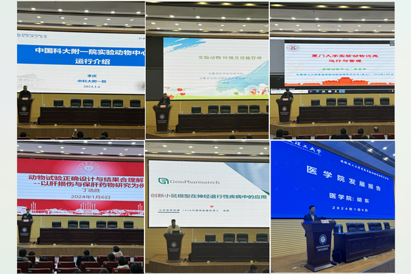 中国科技大学教授李庆、安徽省医学科学研究院副研究员李舜、厦门大学实验动物中心主任苏金华、中国药科大学教授丁选胜、江苏集萃药康生物科技股份有限公司CNS&代谢实验室负责人漆豪应邀出席会议,并分别作题为《中国科大附一院实验动物中心运行介绍》、《实验动物环境及设施管理》、《厦门大学实验动物设施运行与管理》《动物试验正确设计与结果合理解读--以肝损伤与保肝药物研究为例》、《创新小鼠模型在神经退行性疾病中的应用》的主题报告。会上,专家们就实验动物的研究开发与应用、实验动物科学与产业的发展、实验动物中心管理等方面与师生进行了深入交流。