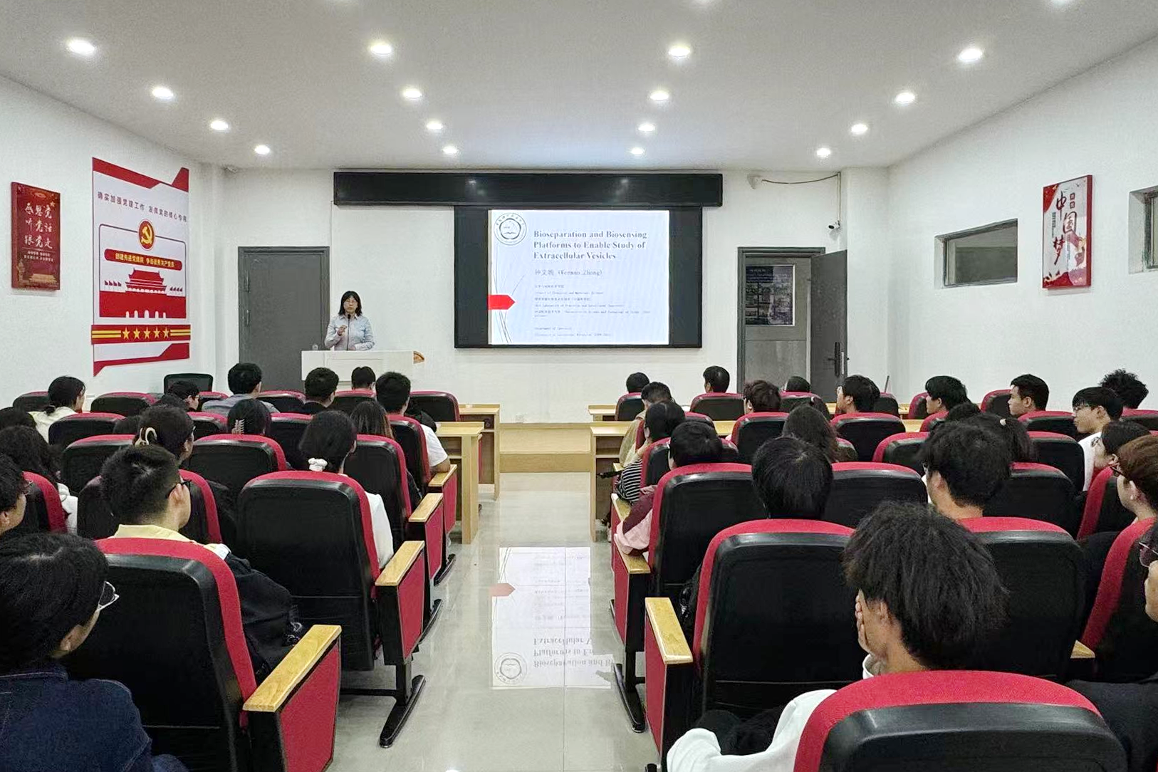 钟文婉教授为医学院师生作题为《Bioseparation and Biosensing Platforms to Enable Study of Extracellular Vesicles》的学术报告。细胞外囊泡(extracellular vesicles, EVs)可携带多种生物大分子,负责细胞和组织之间的物质运输,是细胞间通讯的主要介质之一,可作为疾病诊断的理想标志物和治疗递送的优秀载体。然而,EVs非常小(在30-200nm)并且高度异质性,为EVs的灵敏、特异性的检测带来了巨大的挑战。钟教授围绕细胞外囊泡的分离分析技术,介绍了团队开发的数种分析技术来改进EVs分析,主要包括利用DNA纳米结构、纳米酶和磁性纳米材料的建立传感平台,实现对EVs的超灵敏和选择性检测;通过联合不对称流场流动分离和毛细管电泳的分离技术增强EVs的分离效率,从而通过LC-MS/MS实现对EVs中分子进行特异性的高准确性鉴别等方面进行了报告。期间,钟文婉教授与与会师生进行了热烈互动,并就人才培养及科学研究合作事宜进行了交流。