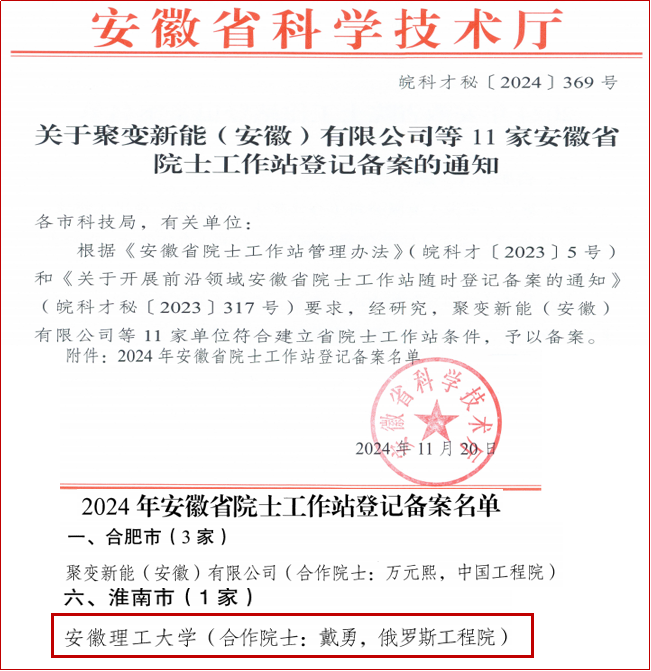11月20日,根据安徽省科学技术厅发布的《关于聚变新能(安徽)有限公司等11家安徽省院士工作站登记备案的通知》获悉,依托我校申报的戴勇院士工作站成功登记备案,是这批成功登记备案的安徽省院士工作站中唯二的医学类院士工作站之一,也是我校首个成功登记备案的医学类院士工作站。