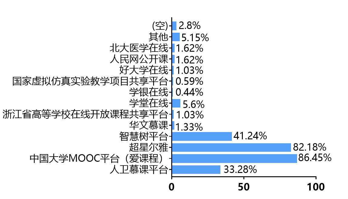 13.采用的网络MOOC\ SPOC课程平台情况调查,中国大学MOOC和超星尔雅高达80%以上,医学生使用的国家级规划教材出版社出品的人卫慕课平台也受到一定的欢迎 ,见图13: