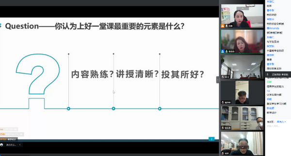 李菲菲教授以 “你认为上好一堂课最重要的元素是什么” 的问题互动展开培训。紧紧围绕国家金课标准,对标“两性一度”的内涵和要求,坚持教学设计的底层逻辑应以“学生发展”为中心,指导教师在通过 “三个一”完成教学设计,即说一个好故事、多一些创新教学活动、练一练授课技巧,要时刻关注学生学到了什么。如何“说一个好故事”,她从课程导入-问题提出-知识组织-内涵提升进行教学案例设计,通过案例融合展示对思政元素如何融入教学给予了指导,启发与会教师将专业故事和思政故事结合起来,活灵活现,达到沟通心灵、启智润心、激扬斗志的效果。如何“多一些创新教学活动”,她结合实例指导了如何通过开展翻转课堂、自学讨论、智慧教学、多元互动等方式有效实施创新教学活动,让课堂活起来、学生忙起来。如何“练一练授课技巧”,她从充分准备、3-2-1原则、仪态气场、语速语调、眼神动作、口诀小结、“B”键暂停、表扬鼓励等方面无私传授了自己的授课技巧,并强调授课的终极技巧是“走心”。