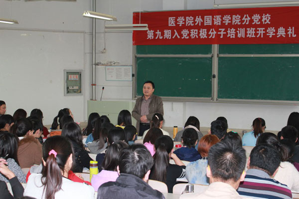 10月30日下午,医学院、外国语学院分党校第九期入党积极分子培训班开学典礼在医教403教室举行。医学院党委书记叶松出席典礼,外国语学院党委书记石秀光出席典礼并讲话。典礼由外国语学院党委副书记程秀霞主持。