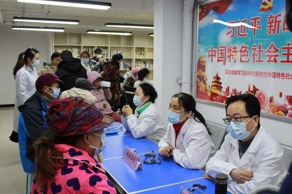 在社区党群服务中心门前,参加活动的师生在小区宣传栏上张贴了疫情防控和健康知识宣传海报,向小区居民发放防疫物品和常用药品。在社区服务中心内,党员发挥专业优势为社区居民进行血压测量、心脏听诊等健康检查,同时提供疫情防控和健康咨询服务。