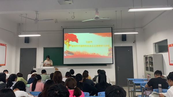 本次理论活动分为四个环节进行。先是各个学生小组代表采取口头讲解和播放相关视频的方式,分别带领大家学习了《习近平<论中国共产党历史>》《毛泽东、邓小平、江泽民、胡锦涛关于中国共产党历史论述摘编》《习近平新时代中国特色社会主义思想学习问答》《中国共产党简史》等节选内容。接着,同学为大家介绍了“令人敬佩的党史人物”,在场人无不为先行者们“为天地立心、为生民立命”的家国情怀感动。最后大家在辅导员的带领下重温入党誓词,大家的声音高亢激昂,回荡在教室里,展现出了对党的崇高敬意。