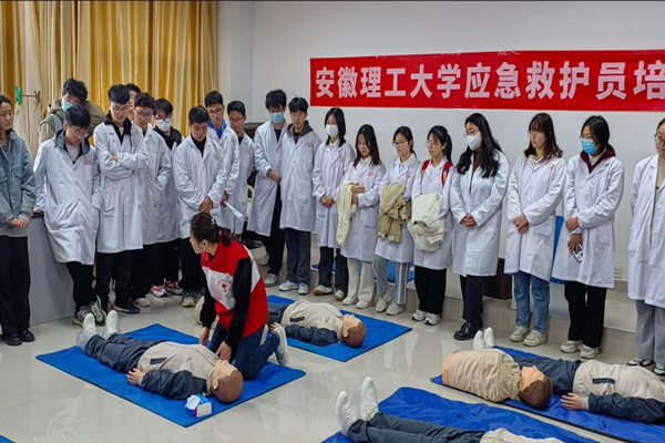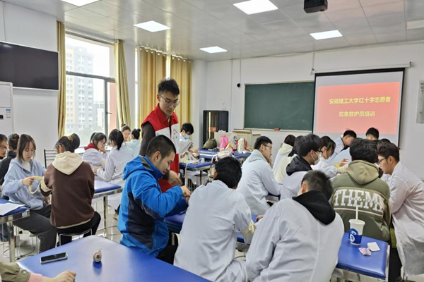 “成人胸外按压的部位在胸部正中乳头连线水平胸骨半部”“头顶部外伤出血较多,应采取三角巾头顶帽式包扎”.......急救培训活动现场,淮南市红十字会的老师结合模拟人用通俗易懂的语言生动地讲解心肺复苏、自动体外除颤仪、包扎等急救知识。参加活动的同学们聚精会神地听讲,踊跃参与模拟真实现场进行伤员处理。