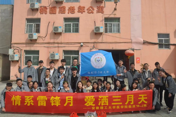 2018级各团支部志愿者分别开展了内容丰富多彩的学雷锋志愿活动。临床1班团支部学子从学校南门出发,一路步行至舜耕山,既做起了环保小卫士,又宣传了雷锋精神的时代意义及春季流行病防范知识。临床2班团支部在义苑食堂与爱苑食堂门前,利用专业设备给全校师生清洗眼镜并宣传护眼知识,活动受到广大师生好评。临床3班团支部组织同学进行“情系雷锋月,爱洒三月天”学雷锋主题志愿服务活动,到淮南市敬老院,开展志愿服务。临床4班团支部举办了“马厂爱心支教”系列活动,捐献步数,为公益事业继续献上一份绵薄之力。医检1班团支部在西瓦村开展了“青春是我们的名片,奉献是我们的风采”雷锋月志愿活动,做农活,翻地,给空巢老人送温暖。医检2班团支部开展“志愿之行”系列活动,活动分两项,“龙湖之行”和到淮南市红雨伞特教中心献爱心及义务表演。