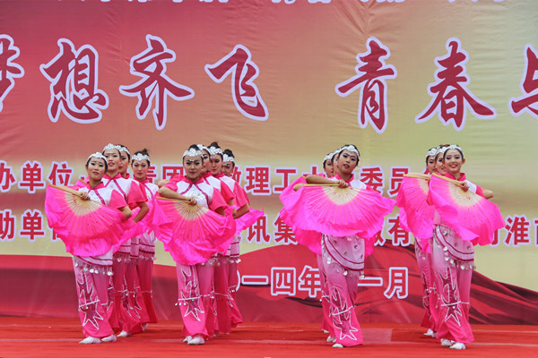 民族舞《茉莉扇香》以安徽花鼓灯为元素,以茉莉花为背景,将柔美的扇子舞与粗犷的架子鼓舞结合起来,使之交相辉映,柔中带刚,舞出了淮河民风的风采。